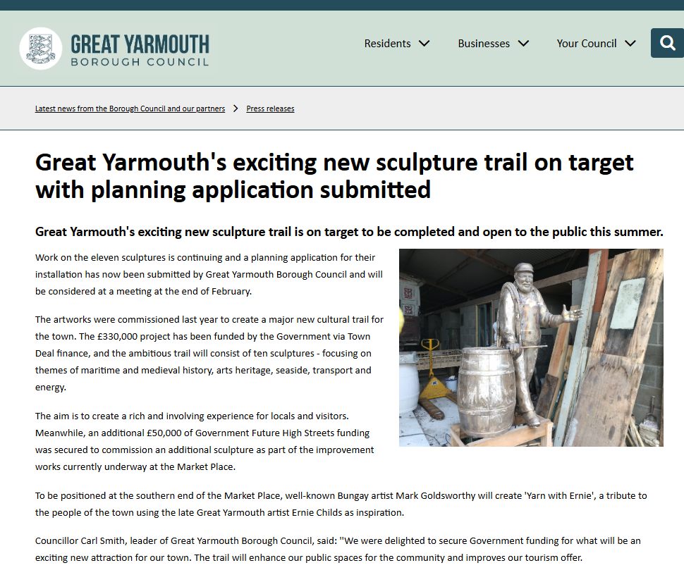 Karen and the family are excited to announce that Mark Goldsworthy, Artist and Sculptor based in Bungay, Suffolk, has been commissioned to design and create a bronze sculpture commemorating Ernie to be erected as part of the Sculpture Trail mentioned in the articles below.