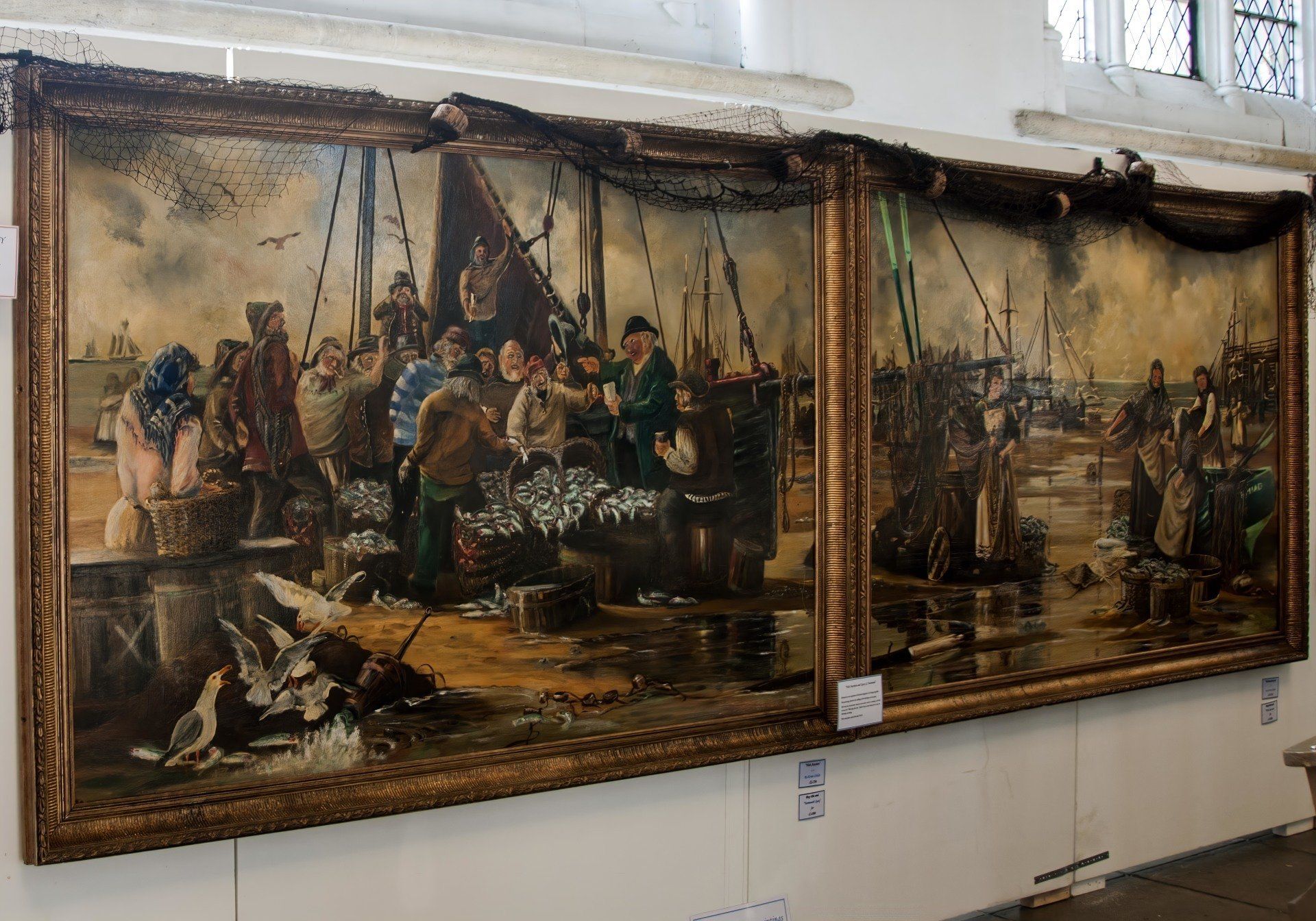 Photographed during an exhibition at Great Yarmouth Minster and draped in fishing net and cork floats, this gilt framed painting measures approximately 6ft 6in x 4ft 7in and is offered for sale individually at £2,000 or the pair together for £3,500.