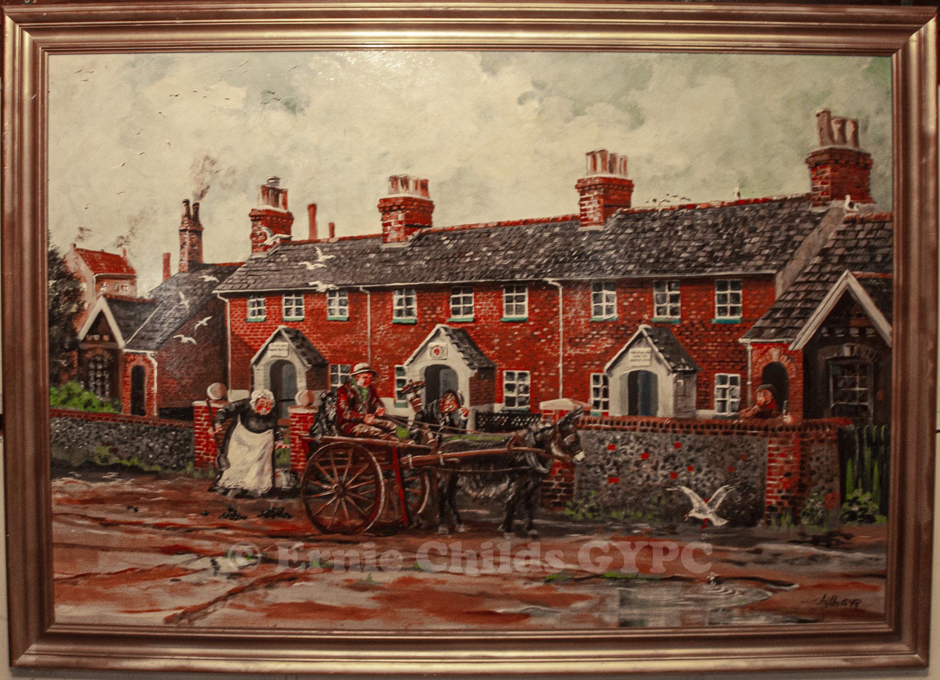 This oils on board, measuring approximately 180 x 137 cm was one of Ernie's all-time favourites. He loved to feature The Jetty at Great Yarmouth, and this study is no exception. The frame is timber and rope.